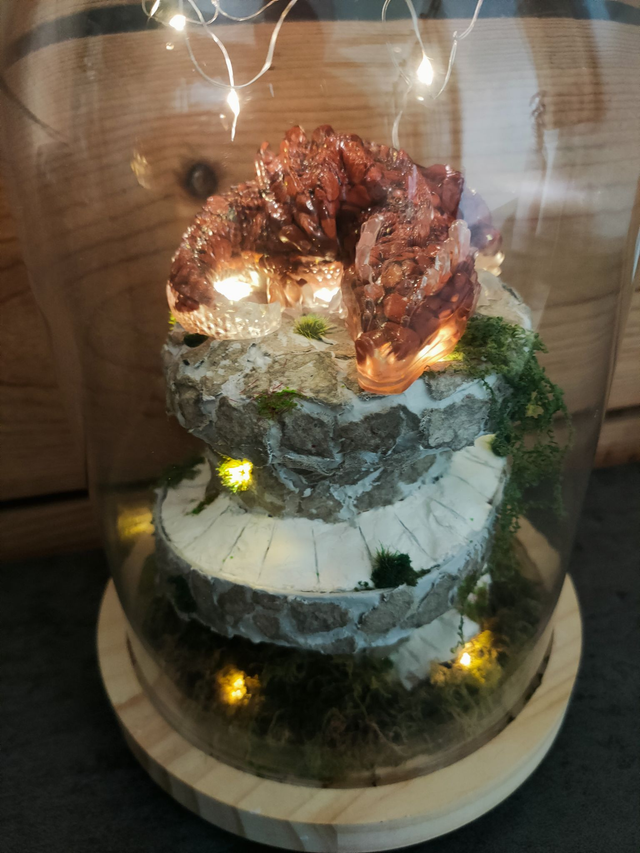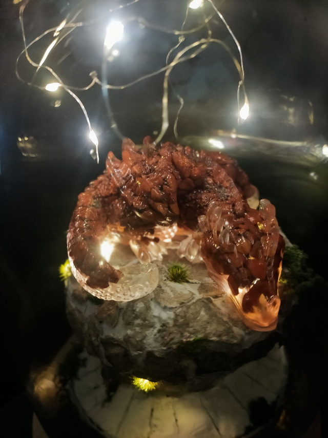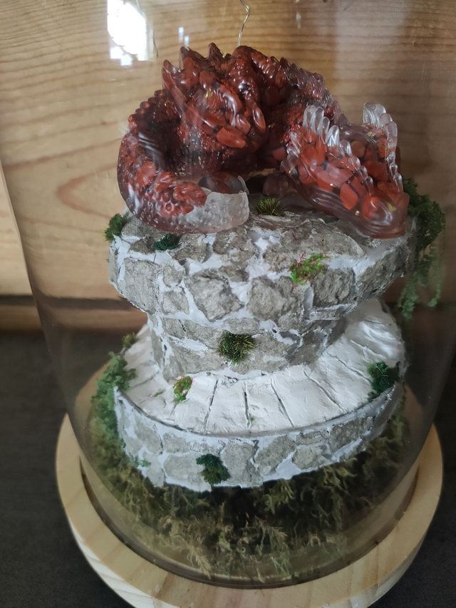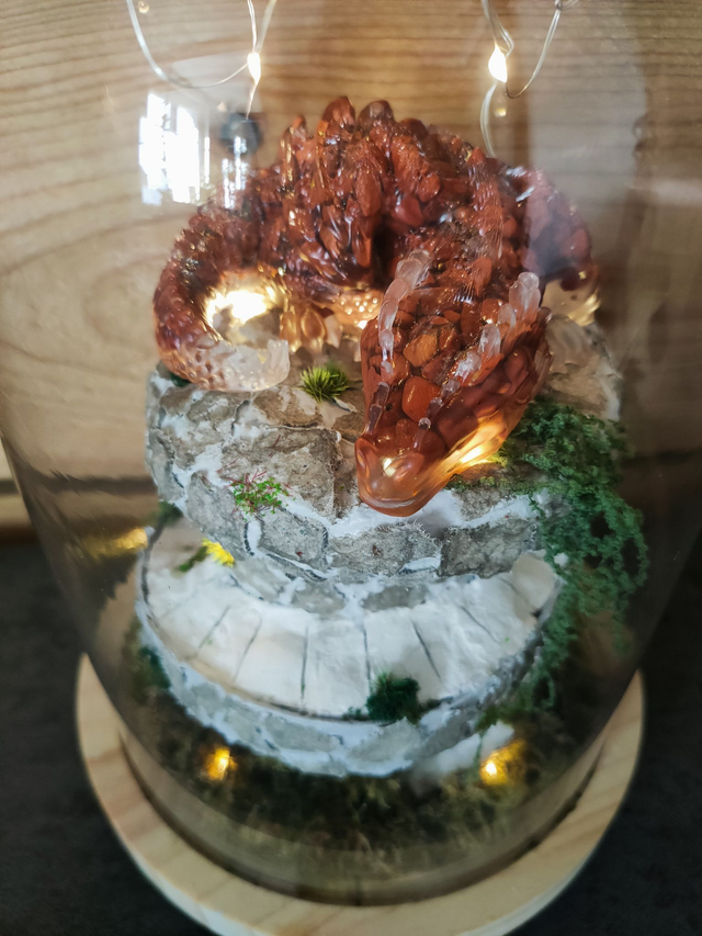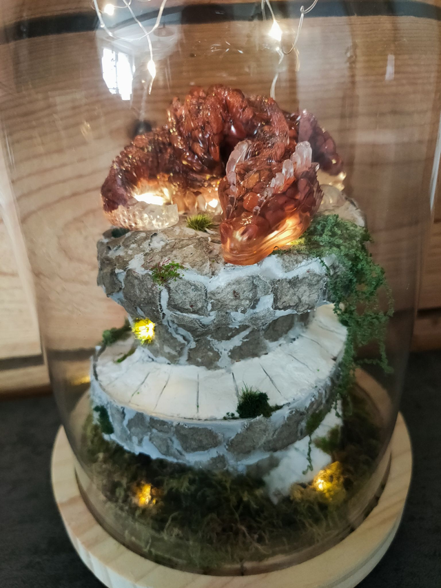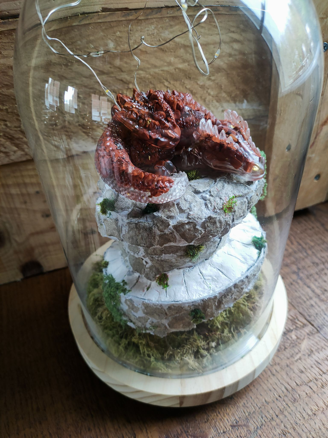 Sous cette cloche de verre, un dragon en Jaspe rouge sommeil du haut de sa tour.