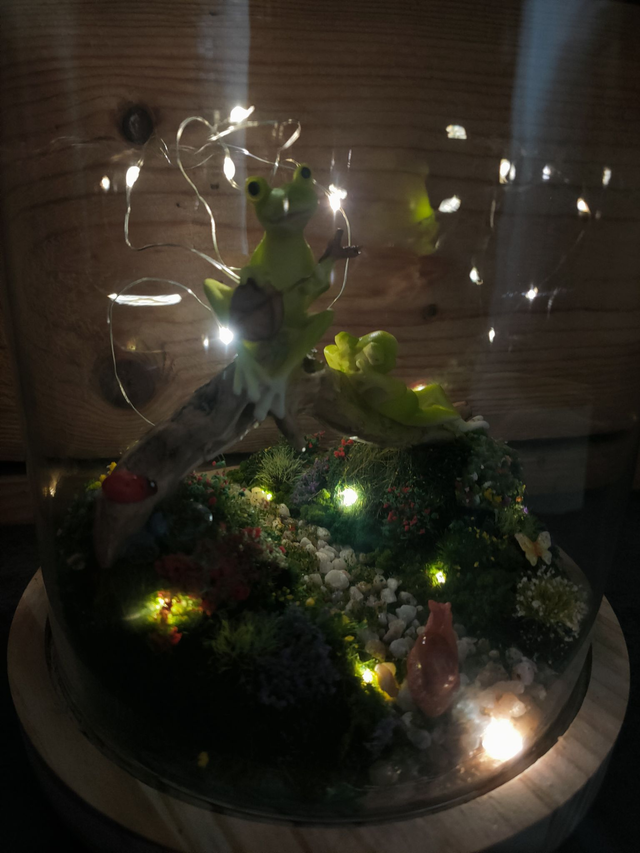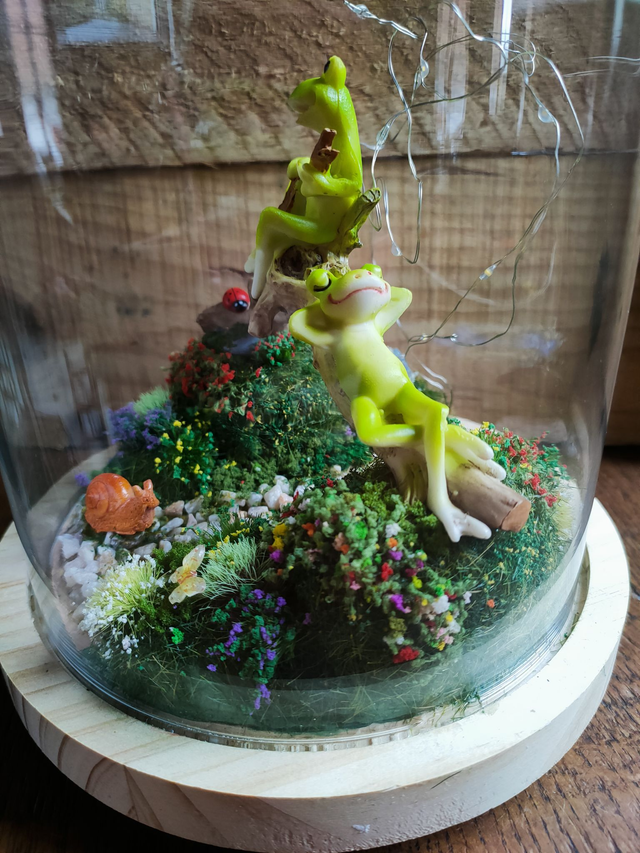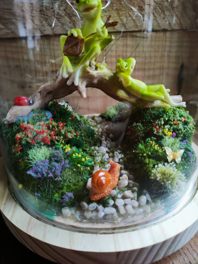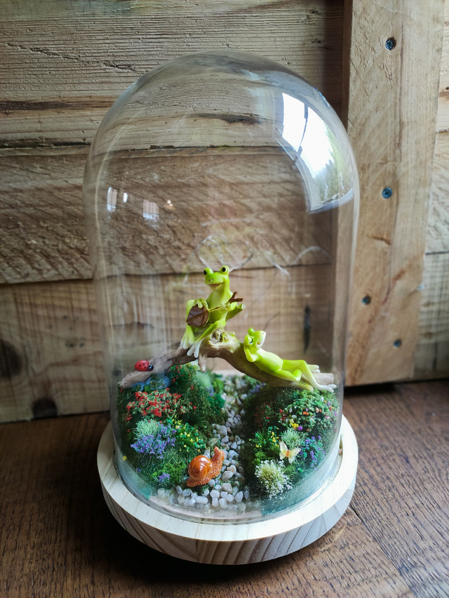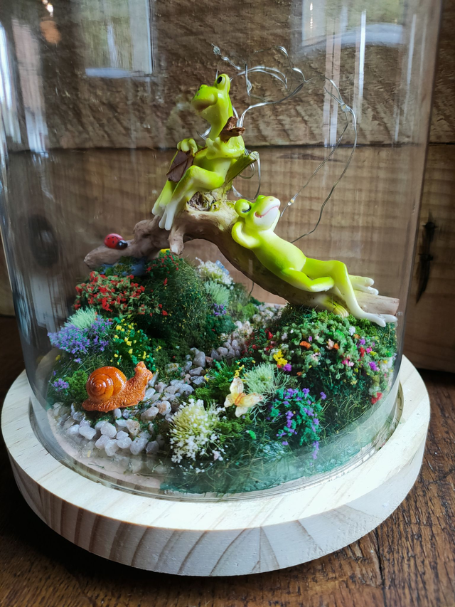 Chaque détail est posé avec soin : mousse végétale, fleurs miniatures, petites touches de couleurs…