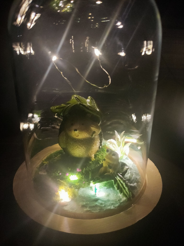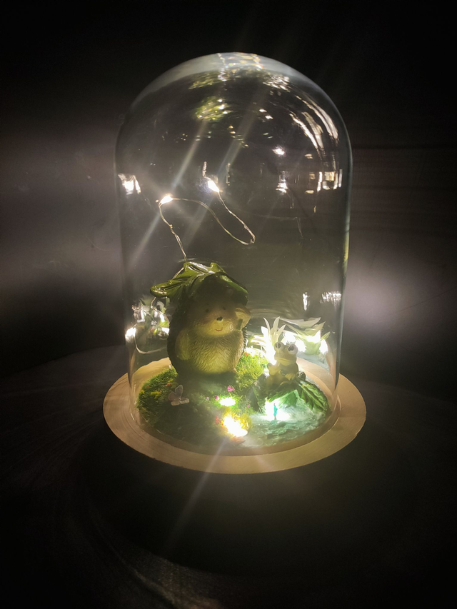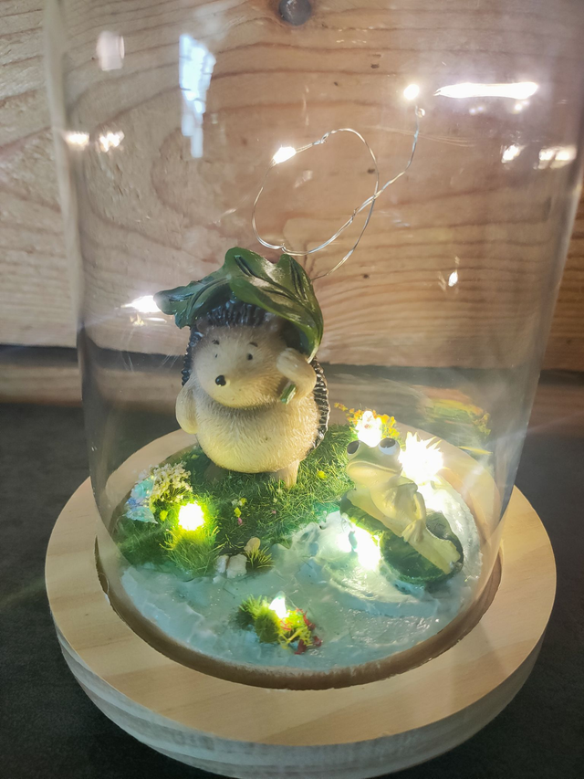 Dans cette scène miniature, il se tient au bord de la rivière Mousse à bulle où une grenouille fait de la barque.