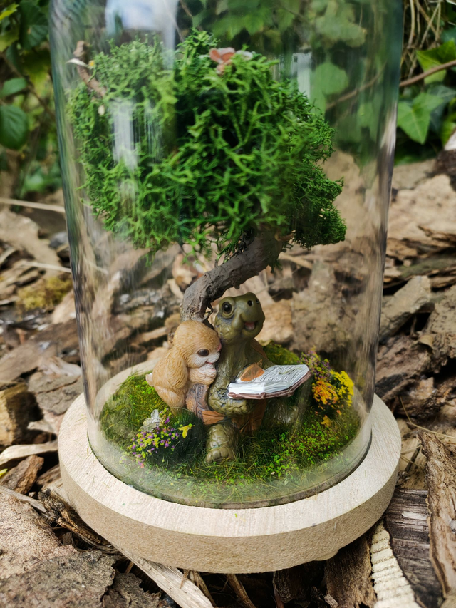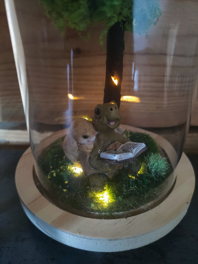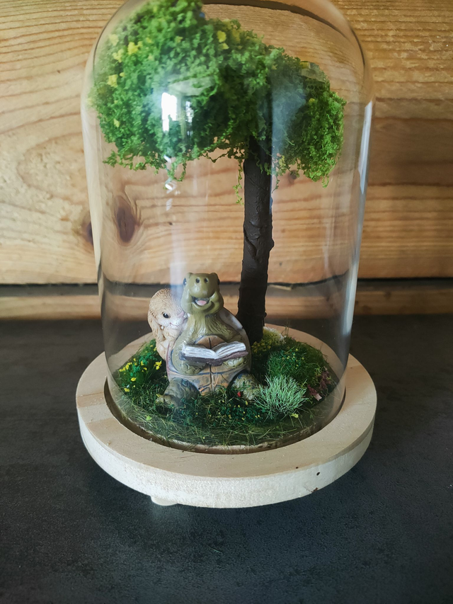 Chaque élément est choisi avec soin : mousse forestière, fleurs miniatures, détails peints à la main…