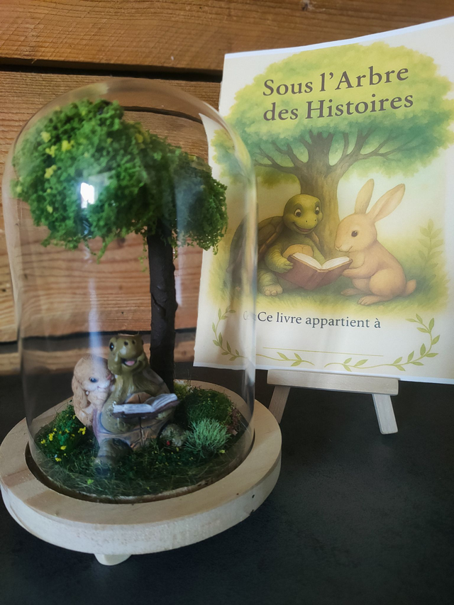 A l'ombre d'un arbre touffu, une tortue et un lièvre partagent un moment suspendu. Elle lit, il écoute. Le monde s'efface peu à peu autour d'eux. Le sol mousseux, les fleurs en éveil, le silence complice des vieux amis...tout murmure une histoire de tendresse, d'écoute et de temps qui passe.