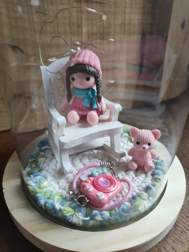 Assise sur sa chaise blanche, la petite rêveuse garde près d’elle un ours rose bonbon et son appareil photo magique — gardiens des souvenirs doux comme l’enfance.